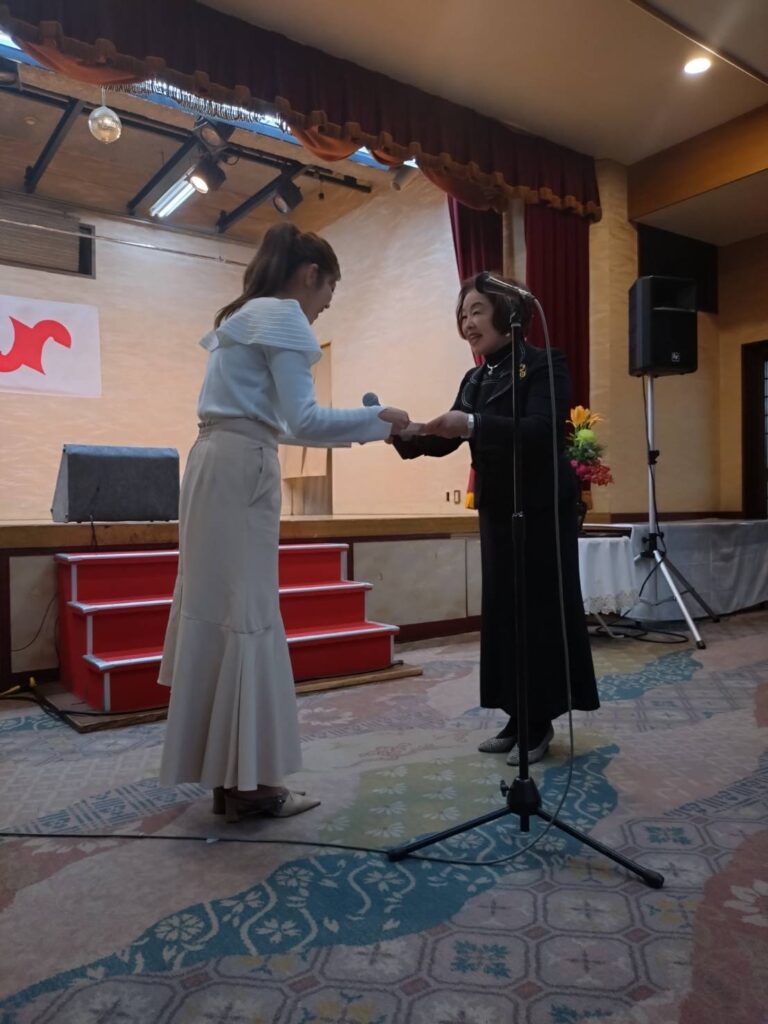 例会では、昨年11月に5年ぶりに開催した「咲椿チャリティーパーティー」の決算報告の後、新会員入会式が執り行われました。