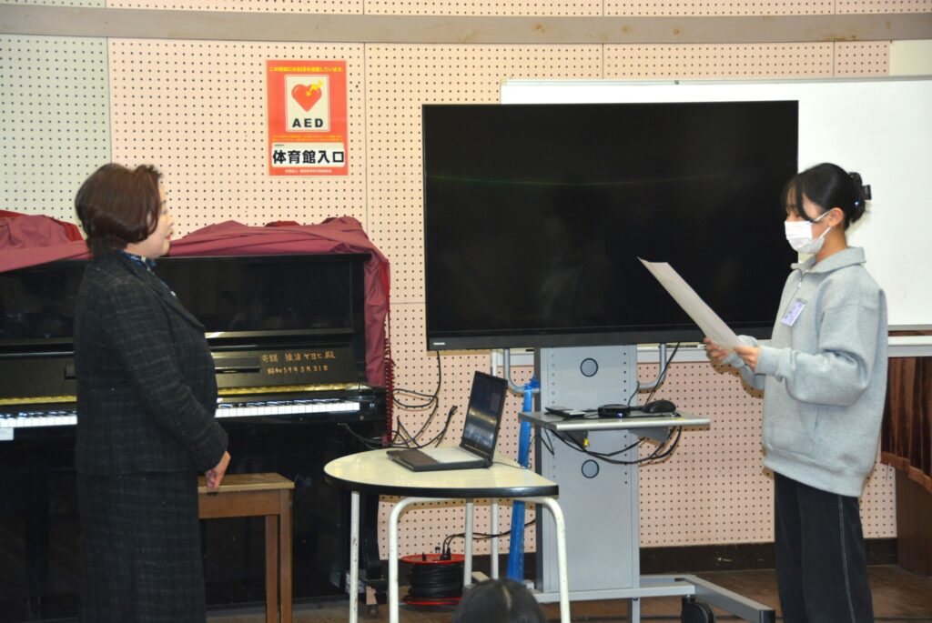 冬休み前の全校朝会の中で、防犯カメラ寄贈に対する感謝状の贈呈式を執り行っていただき、六年生の児童代表より、手作りの感謝状をいただきました。